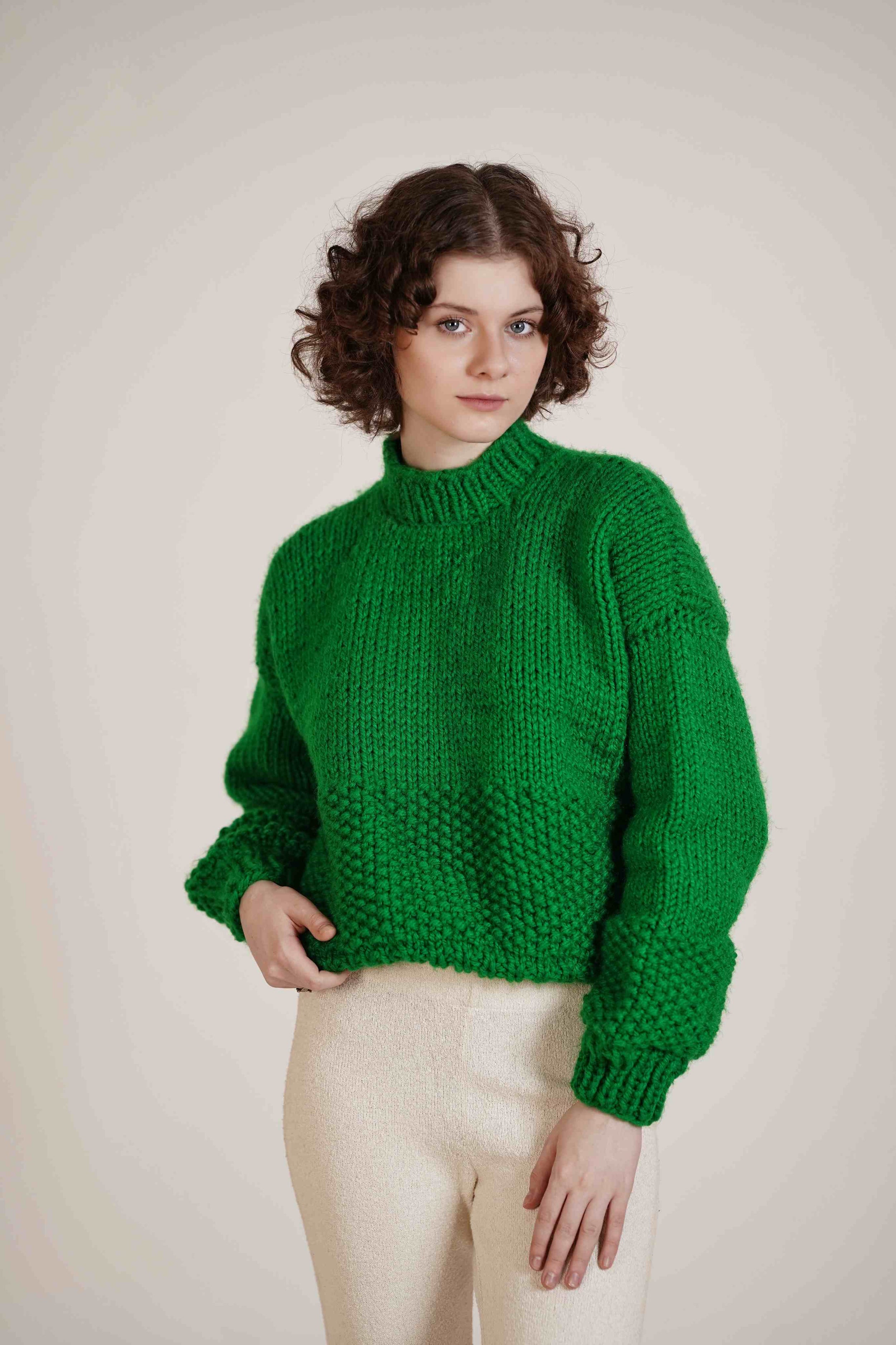 Dark Green hand-knitted chunky sweater. This exquisite piece is meticulously crafted for a relaxed, baggy fit, providing both comfort and style. The voluminous sleeves add a touch of drama, while the ribbed hem and neck offer a polished finish. Whether you're enjoying a cozy evening at home or stepping out on a chilly winter night, this sweater is your perfect companion.Its deep, rich green hue exudes sophistication and complements any winter ensemble. Elevate your cold-weather wardrobe with this statement piece, and embrace the season in style.