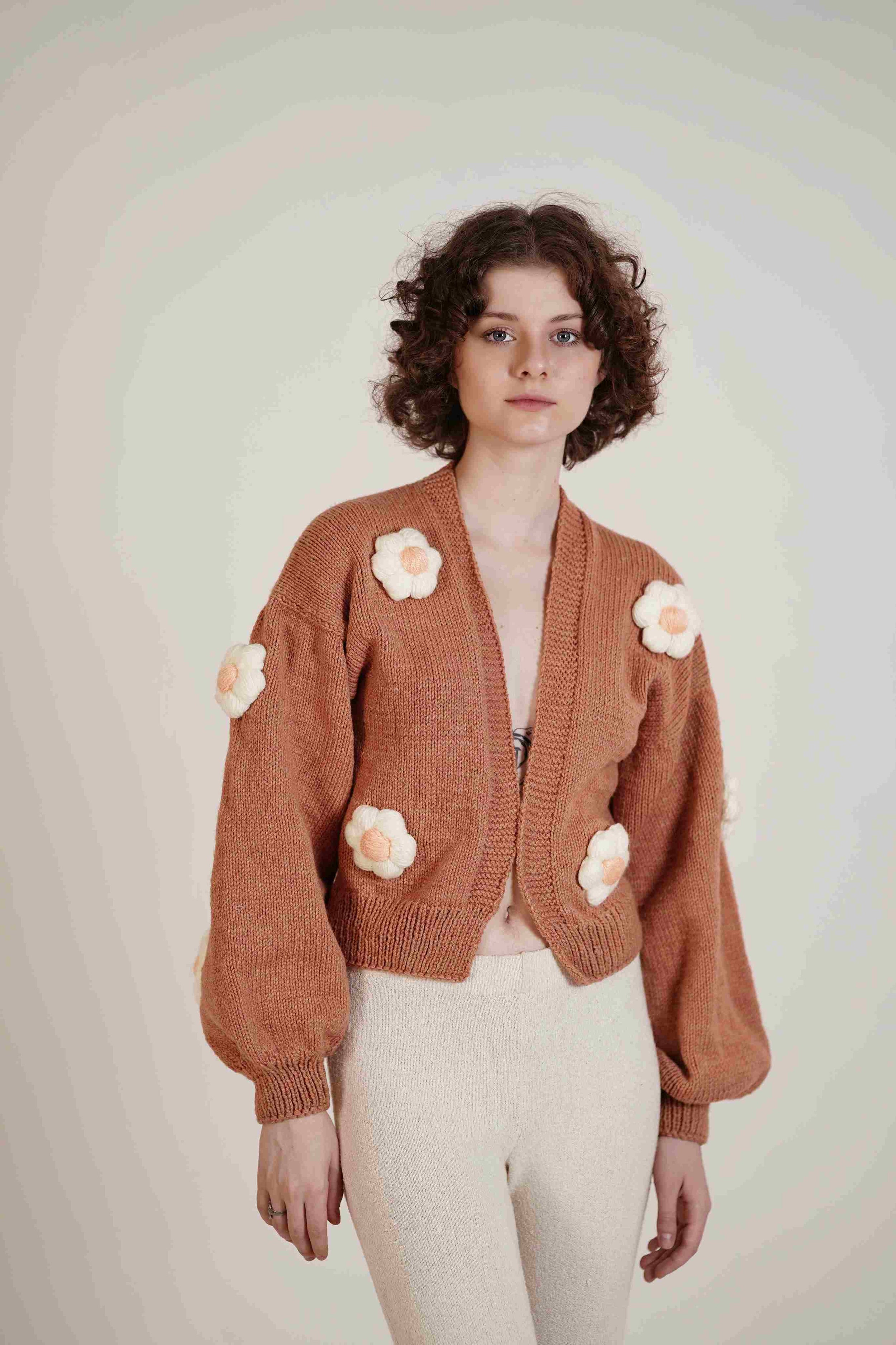 | Hand Knitted Open Cardigan, a testament to artisanal craftsmanship. The charming puff sleeves and delicate hand-crocheted appliqued flowers add a touch of whimsy, infusing your ensemble with a unique personality. The ribbed detailing at the hem, placket, and cuffs not only ensures a comfortable fit but also adds an extra layer of visual interest.This cardigan is more than a garment; it's a work of art that speaks volumes about your individual style. Step out confidently, knowing you're adorned in a piece that's as exceptional as you are. |