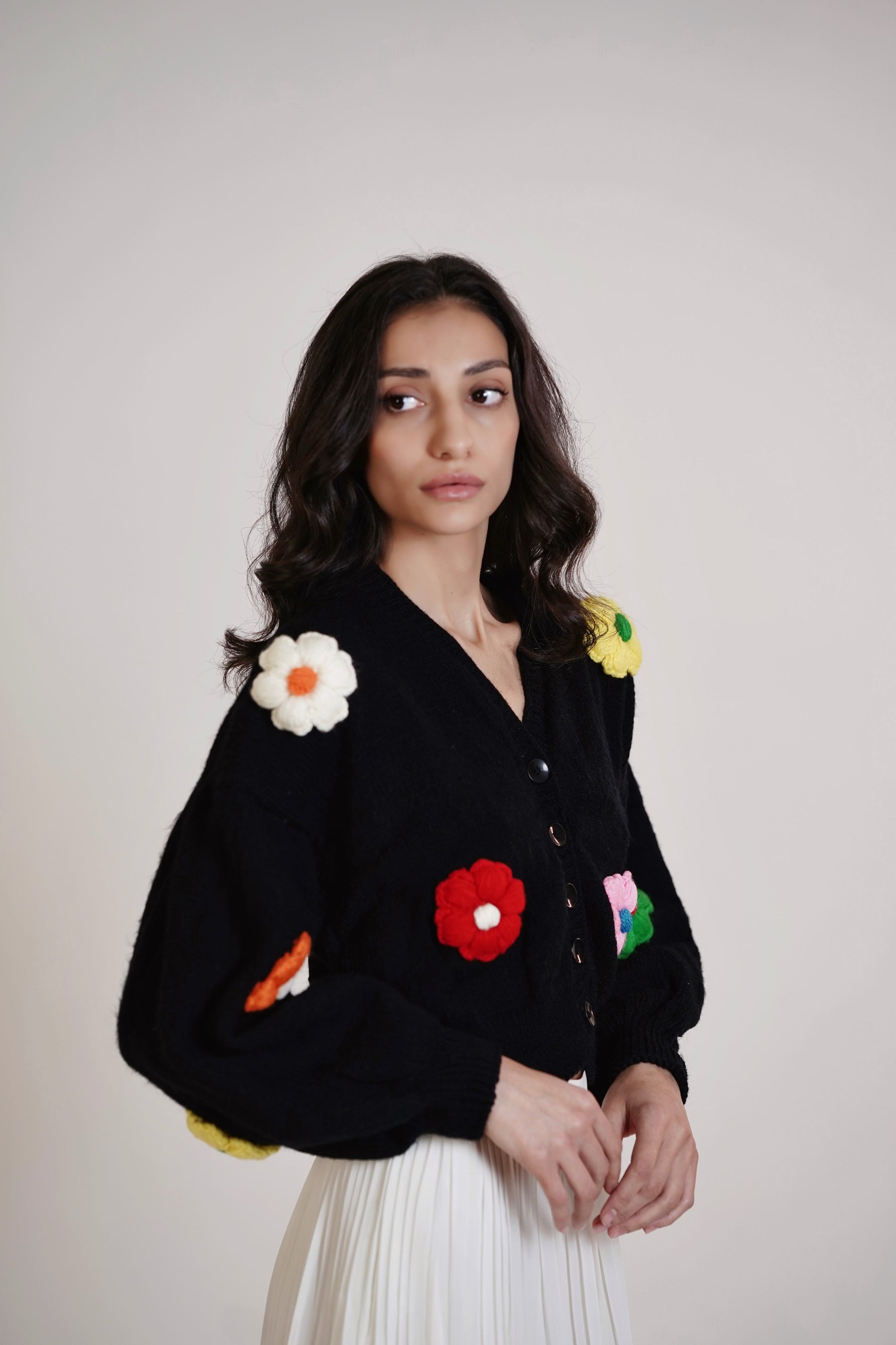 | hand-knitted open cardigan. The puff sleeves add a touch of whimsy, while the meticulously hand-crocheted multi-color flowers bestow a delicate, artistic flourish. The ribbed detailing at the hem, placket, and cuffs provides a tailored finish, ensuring a snug yet comfortable fit. This cardigan is a testament to the artistry and attention to detail that goes into crafting each piece, making it a standout addition to any wardrobe. Experience the beauty of handcrafted fashion and add this unique piece to your collection. |