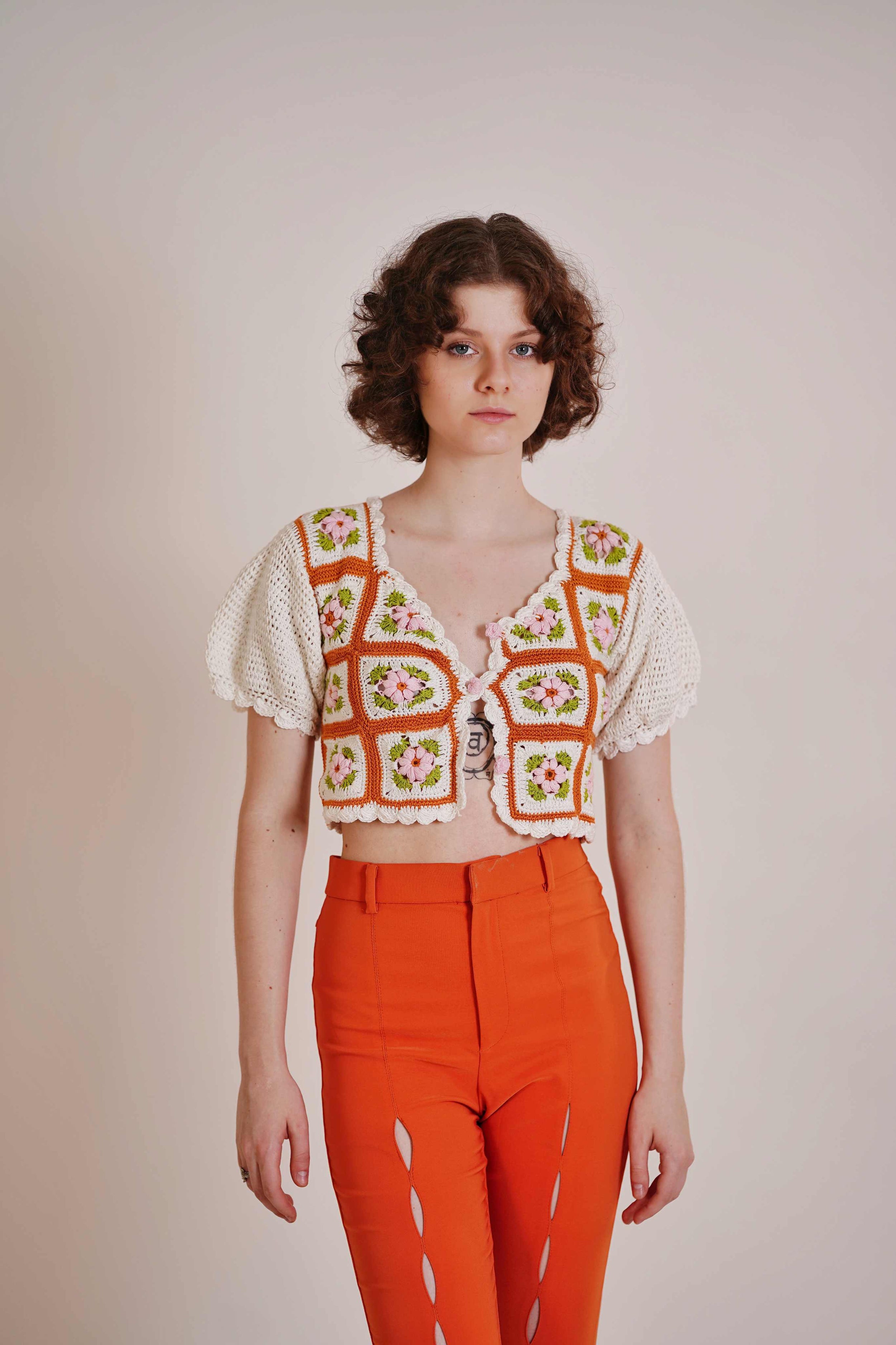 Hand Crocheted Floral Crop Top, a blooming masterpiece that exudes femininity and charm. The delicate floral motifs intertwine with precision, creating a stunning visual display. The off-crochet sleeves add an extra touch of elegance to this blouse, making it a versatile piece for any occasion. Whether paired with high-waisted jeans or a flowing skirt, this crop top is bound to turn heads. Elevate your style with this hand-crafted beauty that celebrates the art of crochet. Step into a world of timeless elegance and grace.
