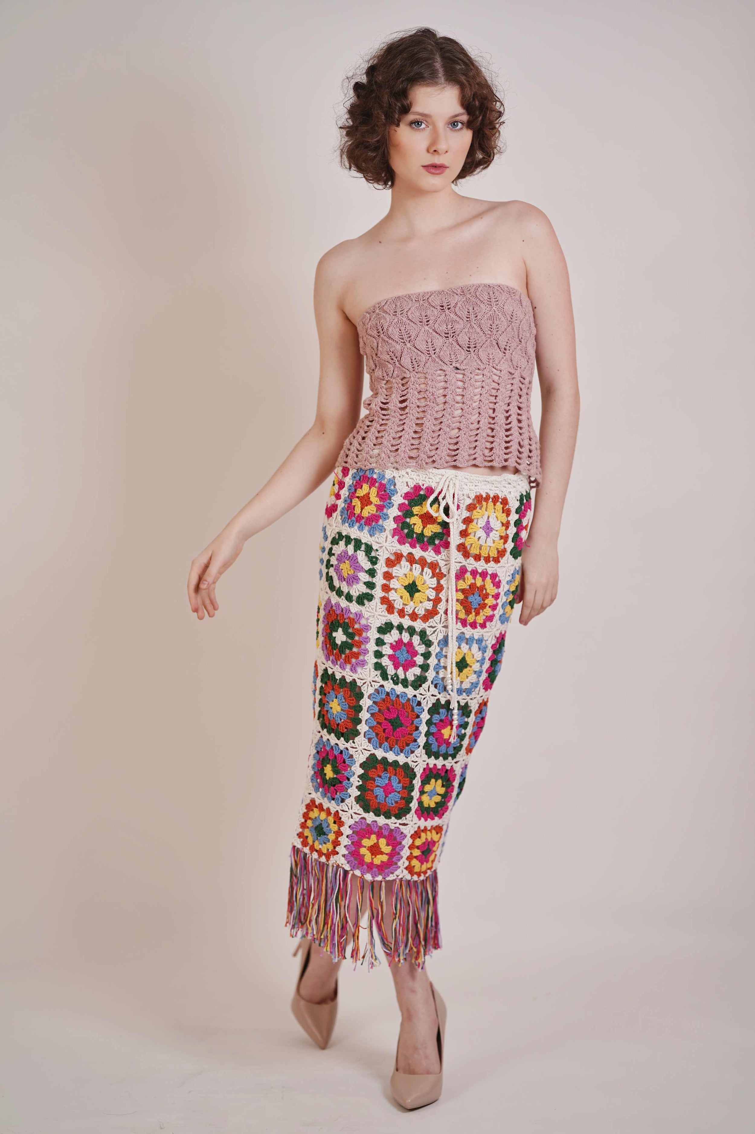 Granny Square Calf-Length Skirt, a testament to the artistry of crochet. This vibrant piece features a colourful patchwork design, meticulously crafted with intricate granny squares. Lined for comfort and durability, it combines style with practicality. The playful mix of colors and patterns brings a lively energy to any outfit. Step into the world of crochet artistry with our Granny Square Calf-Length Skirt and embrace the warmth and style it brings. Elevate your fashion with this unique and charming statement piece.
