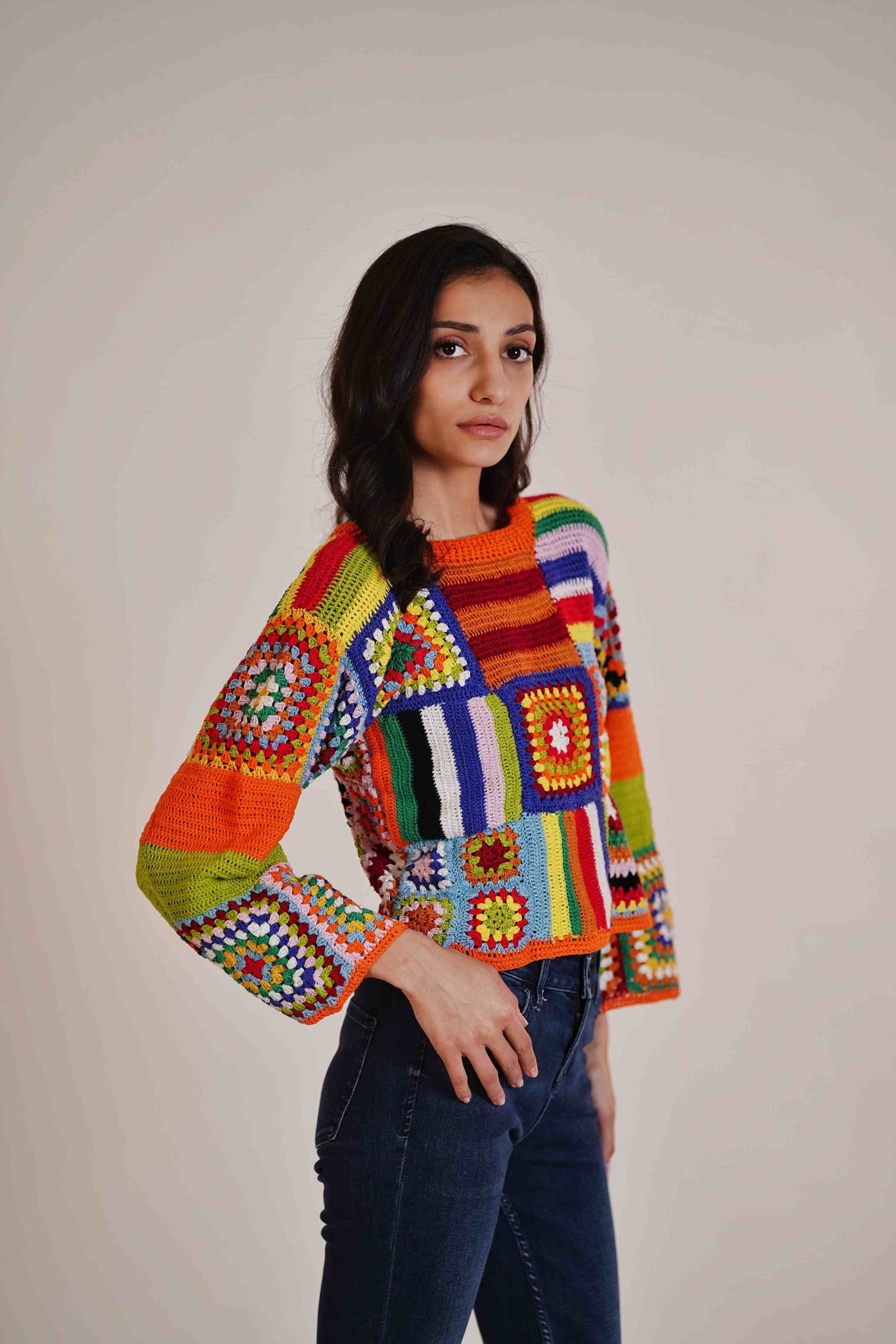 Multicoloured Hand Crocheted Classic Granny Square Patch Cardigan, a vibrant fusion of artistry and warmth. This cardigan is a testament to the time-honoured craft of crocheting, featuring a playful array of granny square patches in a myriad of colours. Each patch is meticulously handcrafted, creating a unique and eye-catching design. The open-front style allows for easy layering, making it a versatile addition to your wardrobe. With its relaxed fit and cozy feel, this cardigan is perfect for adding a touch of bohemian flair to any outfit. Embrace the spirit of handmade artistry with this one-of-a-kind piece. Elevate your style with our Multicoloured Hand Crocheted Classic Granny Square Patch Cardigan.