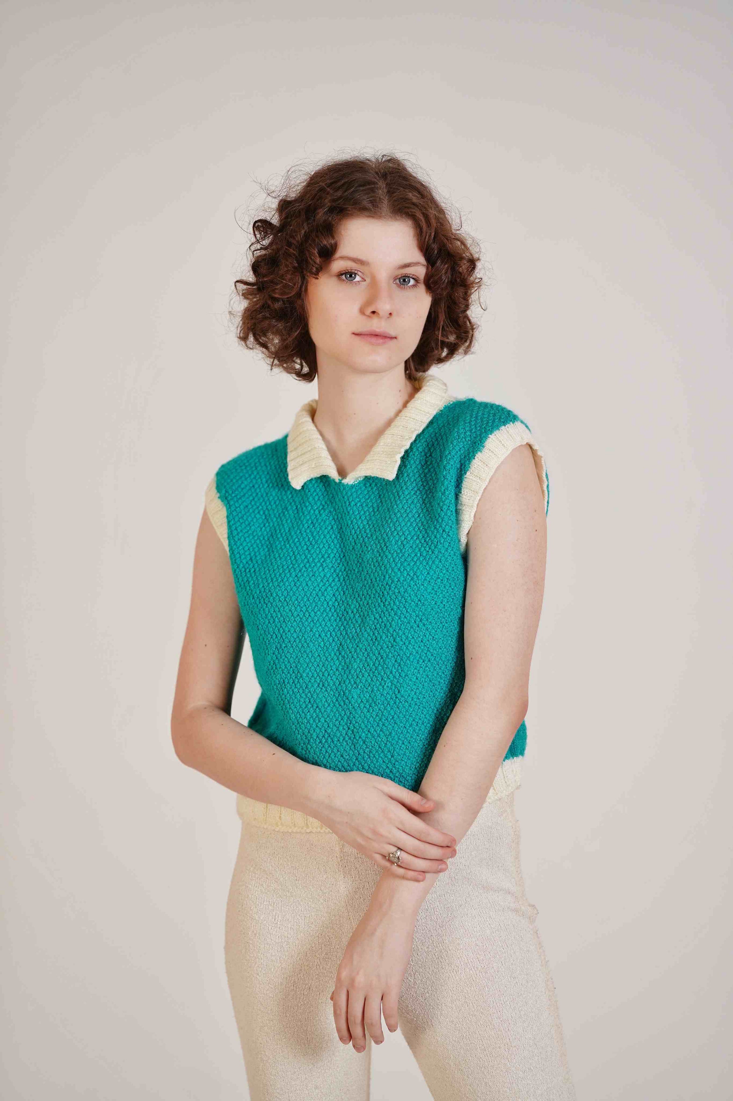 Hand-Knitted Teal Vest. This versatile piece features a classic collar, adding a touch of sophistication to your ensemble. The intricate knit pattern showcases our commitment to craftsmanship and attention to detail. The rich teal color complements a wide range of outfits, making it a versatile addition to your wardrobe.The sleeveless design allows for easy layering, and the ribbed hem provides a comfortable fit. Whether worn over a blouse for a professional look or layered with a sweater for extra warmth, this vest is a must-have for the colder months. Embrace the art of hand knitting with this carefully crafted teal vest and make a statement in style.