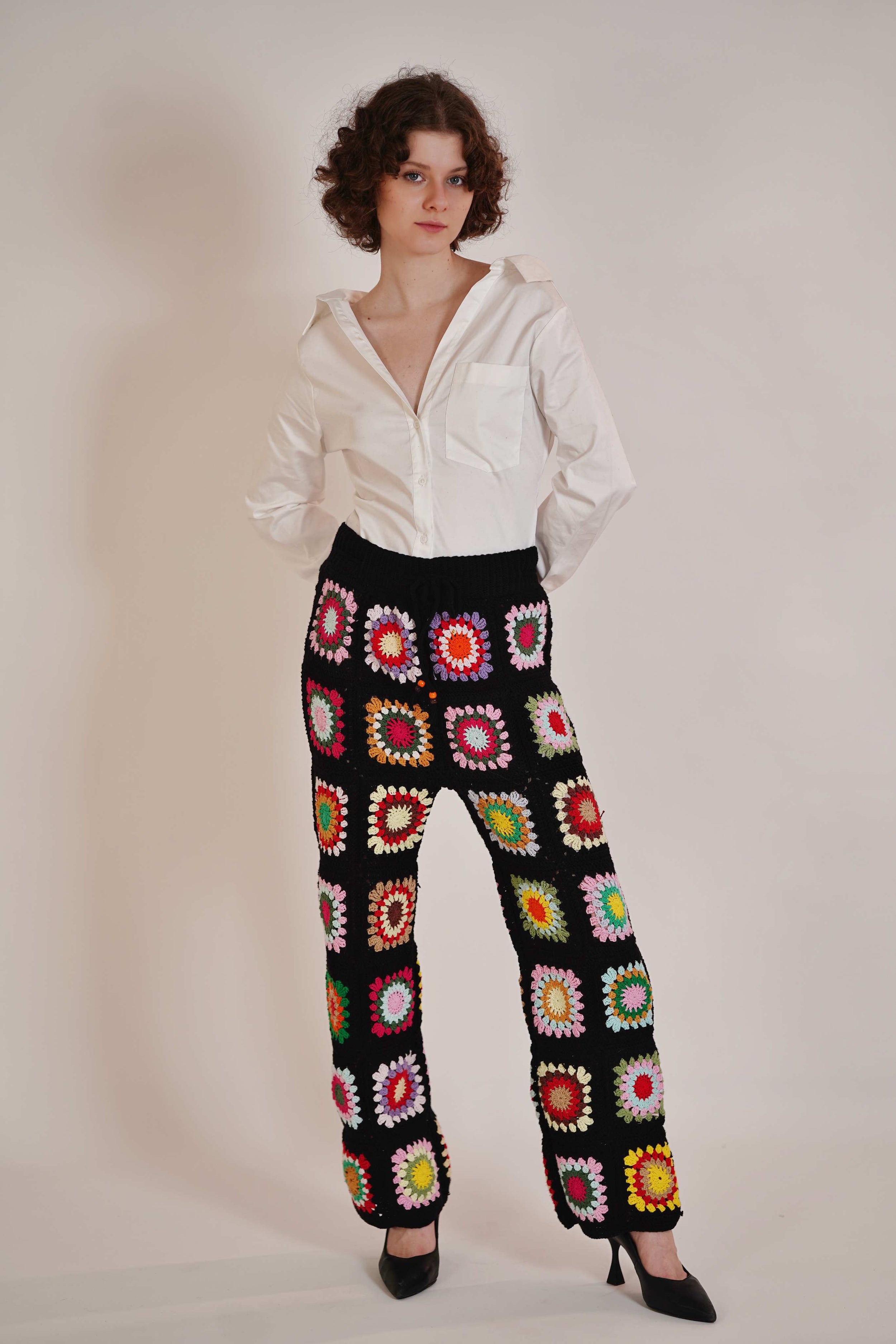 Hand Crocheted Granny Square Patchwork Pant. Each intricately crafted square tells a story of skilled hands and creative spirit. The vibrant patchwork design creates a visually stunning mosaic, making these pants a wearable masterpiece. With an elasticized waistband for comfort and a wide-leg silhouette for easy movement, these pants combine style and practicality effortlessly. Elevate your wardrobe with this unique piece that celebrates individuality and craftsmanship.